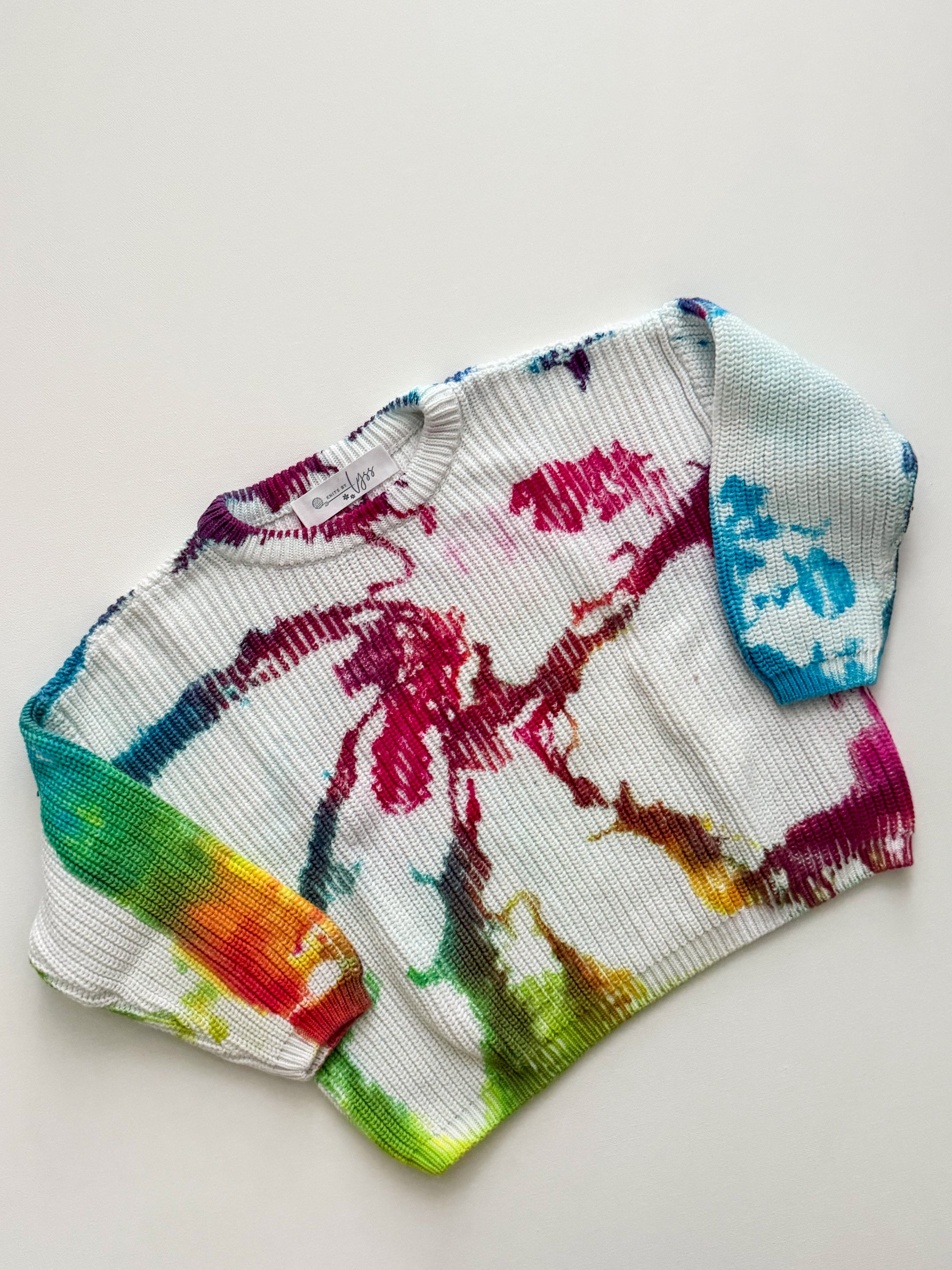 Our Knits By Lyss knitwear line staple: the classic oversized sweater. This sweater is 100% cotton and has been hand tie dyed to give it some color.