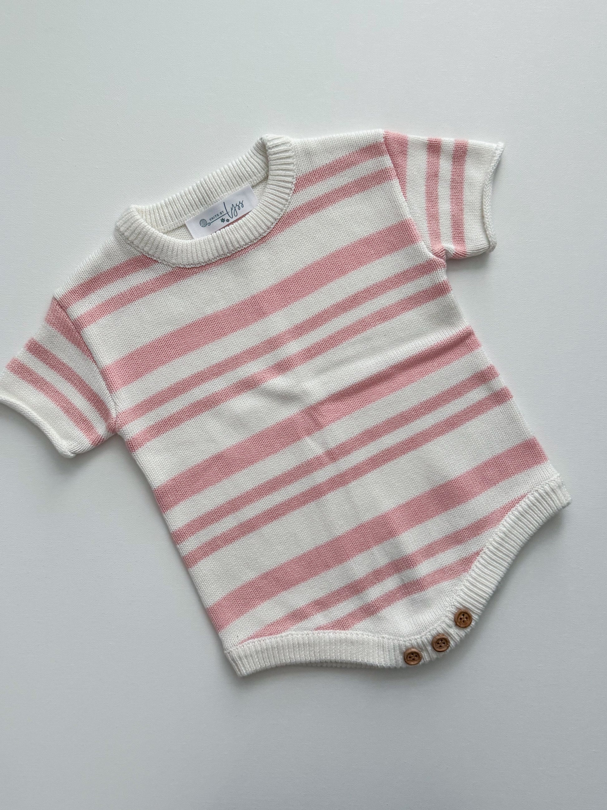 A 100% cotton knit romper with a pink striped design. This piece has a three button closure on the bottom.