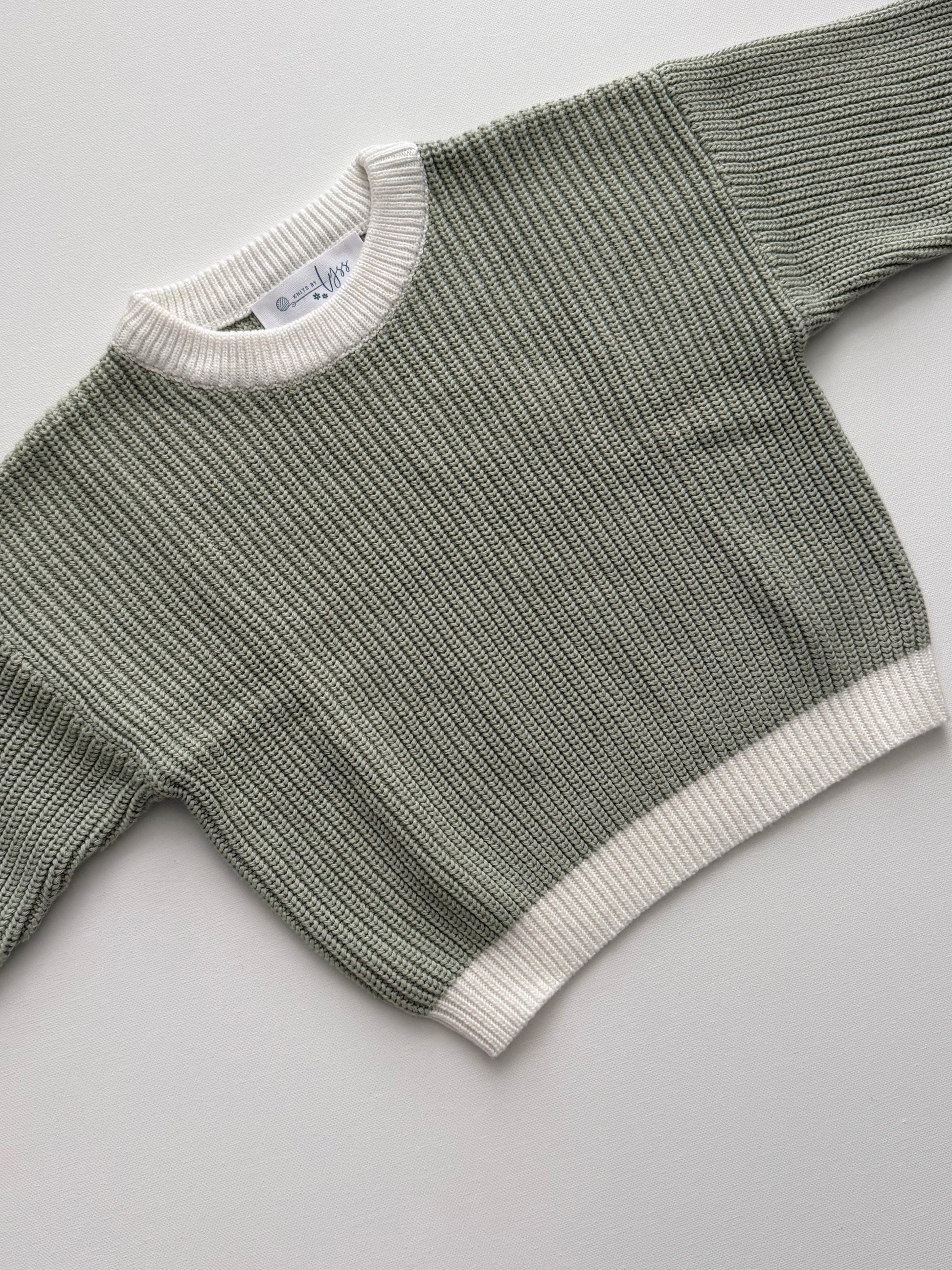 This sage green two tone sweater is 100% cotton. This set has been designed the same as our classic knitwear line with an oversized fit.