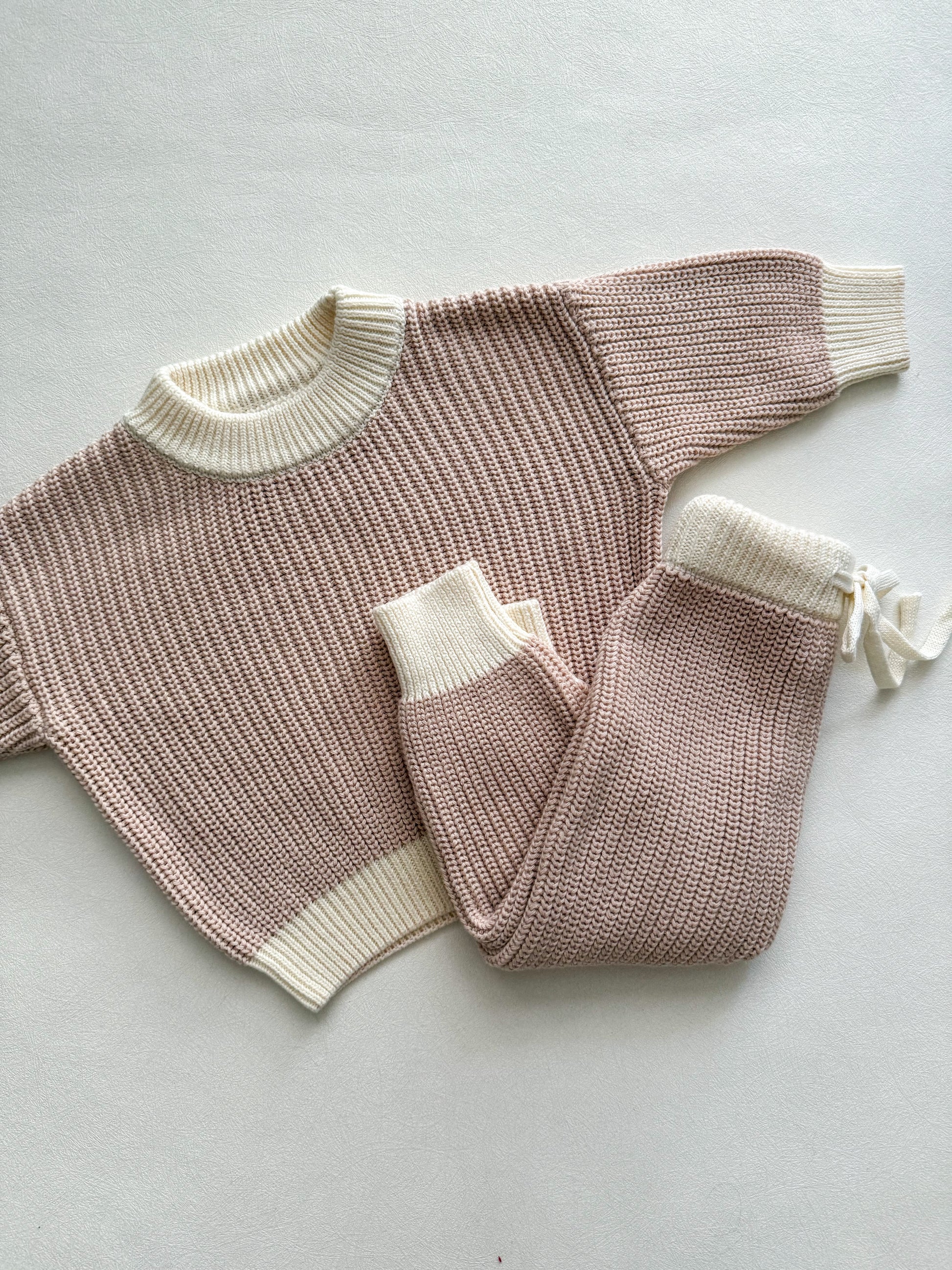 This two tone knit sweater set is 100% cotton. This set has been designed the same as our classic knitwear line with an oversized fit.