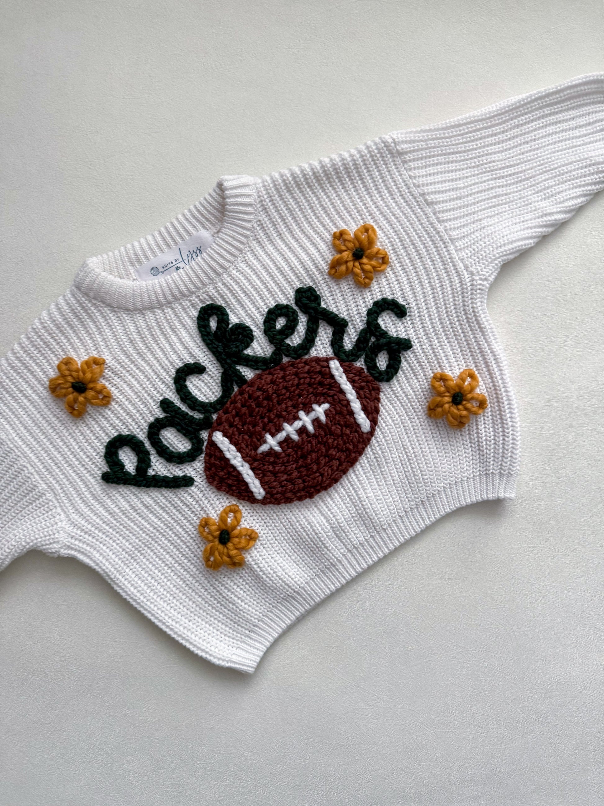 Cheer on your team in style with our cozy, one-of-a-kind hand embroidered sports team sweater. Each piece is carefully stitched by hand, featuring your favorite team name and optional custom designs. Whether you’re at the game, tailgating, or watching from home, this sweater is made to show your team spirit in a unique and personal way.